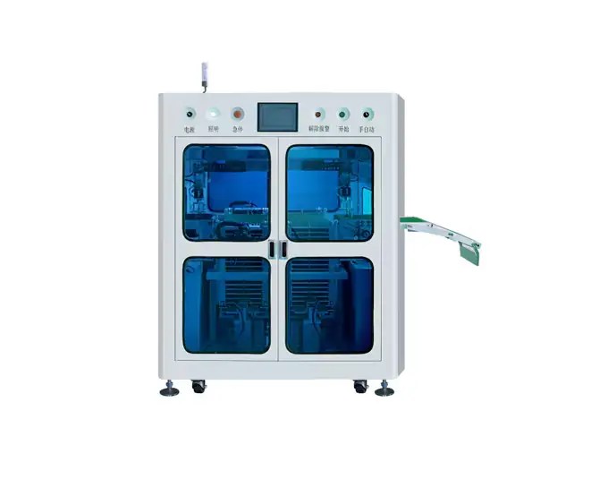 The terminal automatic cleaning machine consists of a workbench and a feeding belt device, a feeding robot arm, a material transfer unit, a CCD camera mechanism, a dust-free cloth cleaning mechanism, a plasma cleaning mechanism, and a feeding robot arm. It is a crucial step in the screen production process, with no dust and a more accurate and smooth touch.